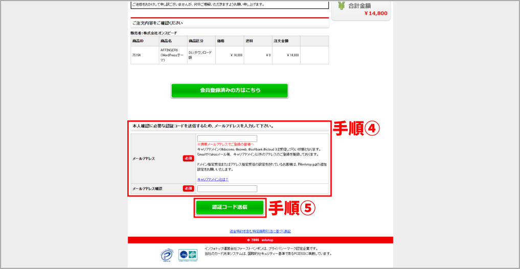 「④メールアドレス」を入力→「⑤認証コード送信」をクリックします。