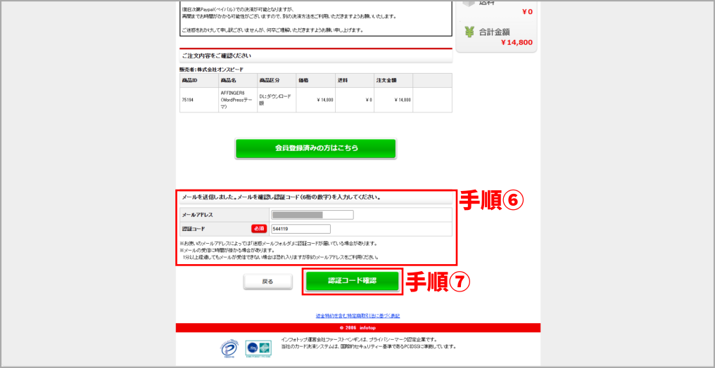 登録したアドレスに「⑥認証コード」が届くのでそれを入力し→「⑦認証コード確認」をクリックします。