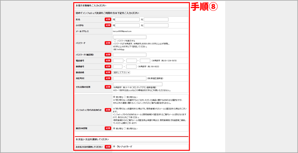 「⑫名前、メールアドレス、公式からのアンケート」を入力しましょう。