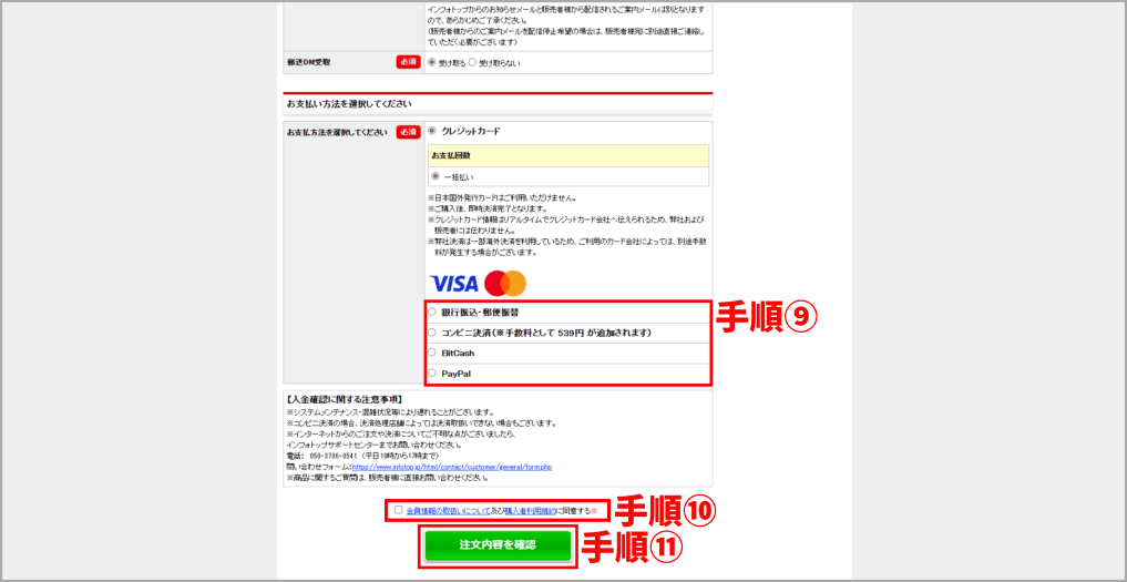 「⑨お支払い方法」を選択→「⑩購入者利用規約に同意する」にチェックを入れ→「⑪注文内容を確認」をクリックしましょう。