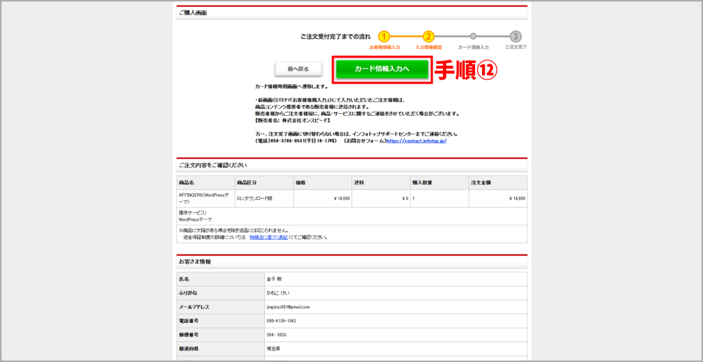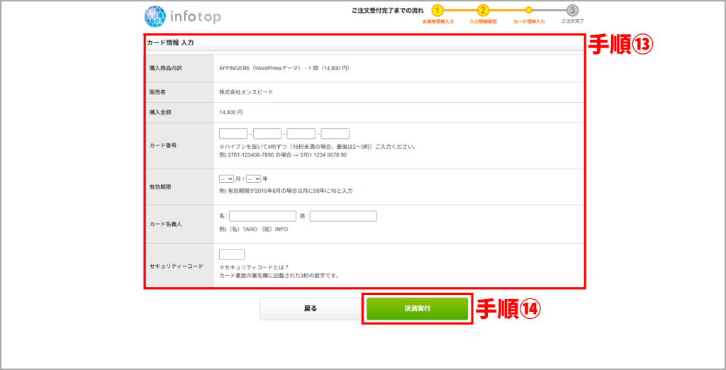 「⑬カード情報」を入力→「⑭決算実行」をクリックしたらAFFINGER6購入は完了です。