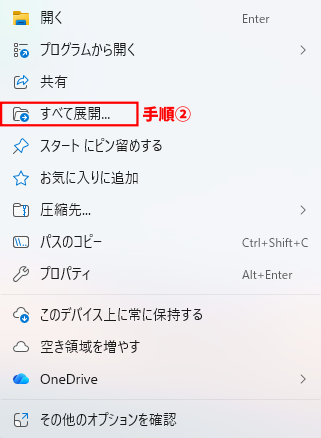圧縮フォルダを解凍するのにフォルダを右クリックして「②すべて展開」を選択しましょう。
