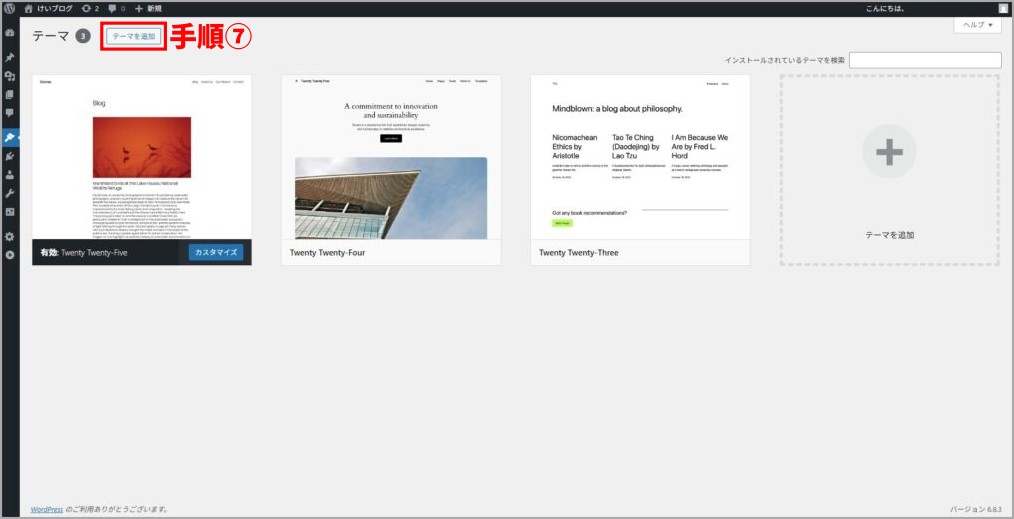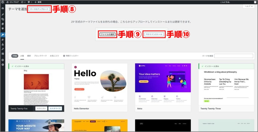 「⑧テーマのアップロード」から先ほどの“zipファイル”を「⑨ファイル選択」し→「⑩今すぐインストール」をクリックします。