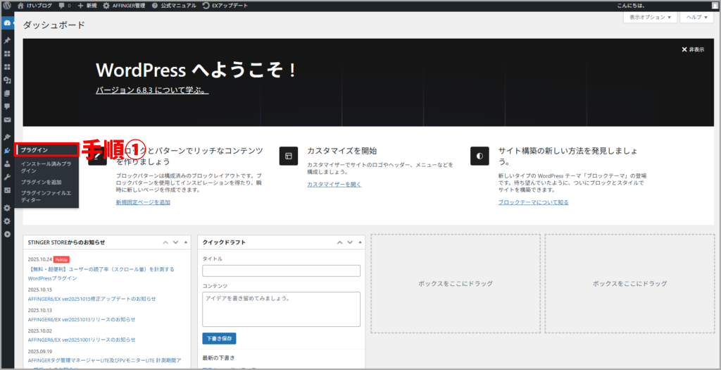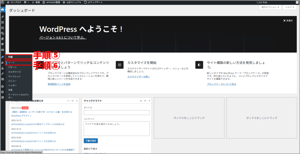 ダッシュボード画面に「⑦AFFINGER ブロック」が表示されたら完了です。