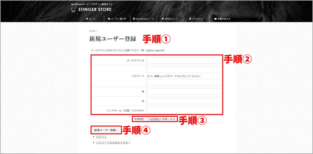 「①STINGER STORE」にログイン→「②ユーザー情報」を入力→「③利用契約に同意します」にチェックを入れ→「④新規ユーザー登録」をクリックします。
