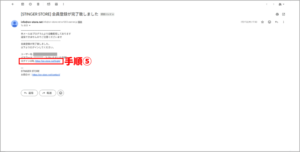 「STINGER STORE」からメールが届くのでメール内の「⑤ログインURL」をクリックします。