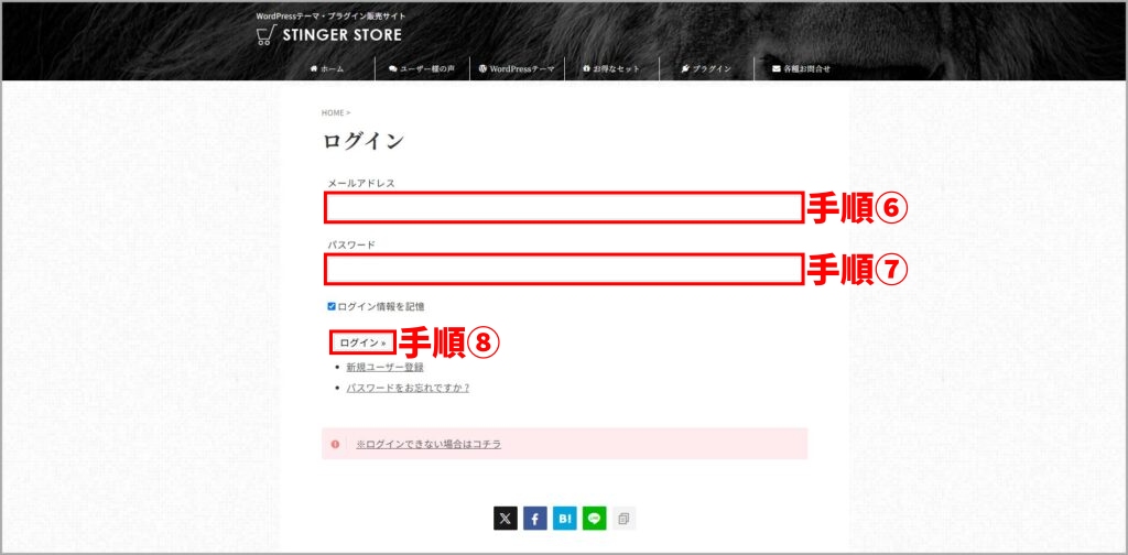 「⑥メールアドレス」「⑦パスワード」を入力→「⑧ログイン」をクリックしてください。
