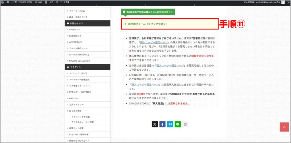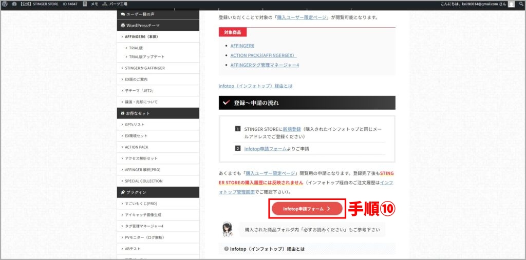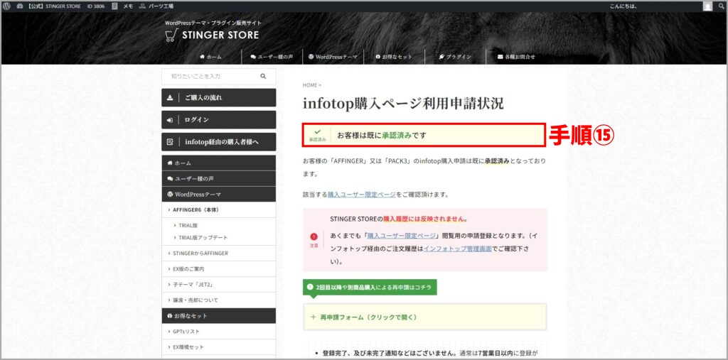 時間を置いてからSTINGER STOREの「⑮infotop購入ページ利用申請状況」に戻り、承認されていたら完了です。