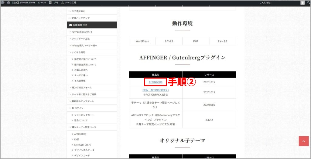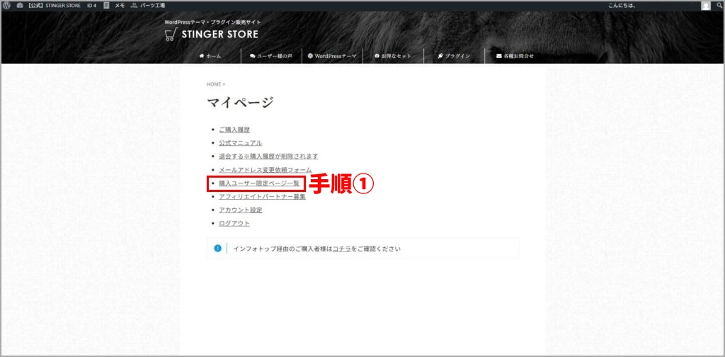 「STINGER STORE」にログインし→「①購入ユーザー限定ページ一覧」をクリックします。