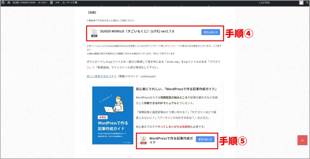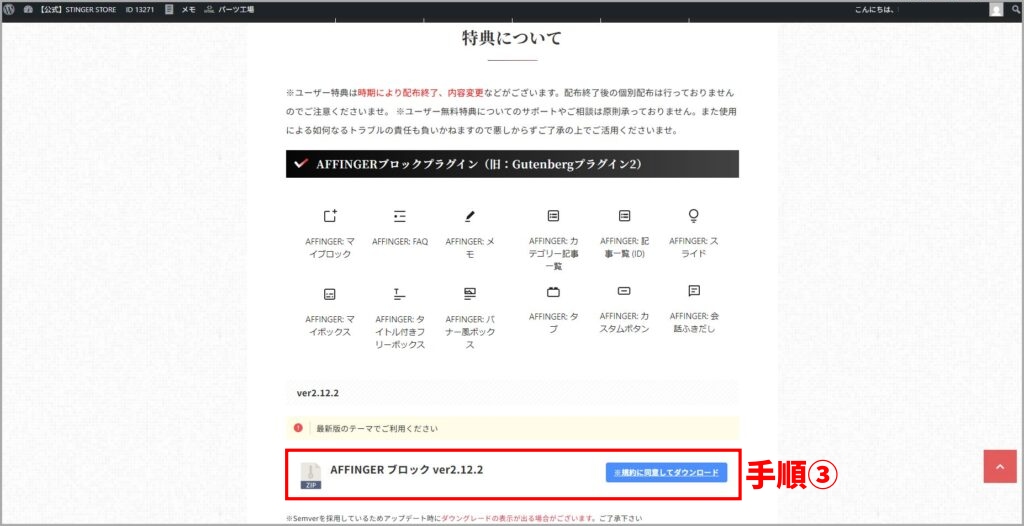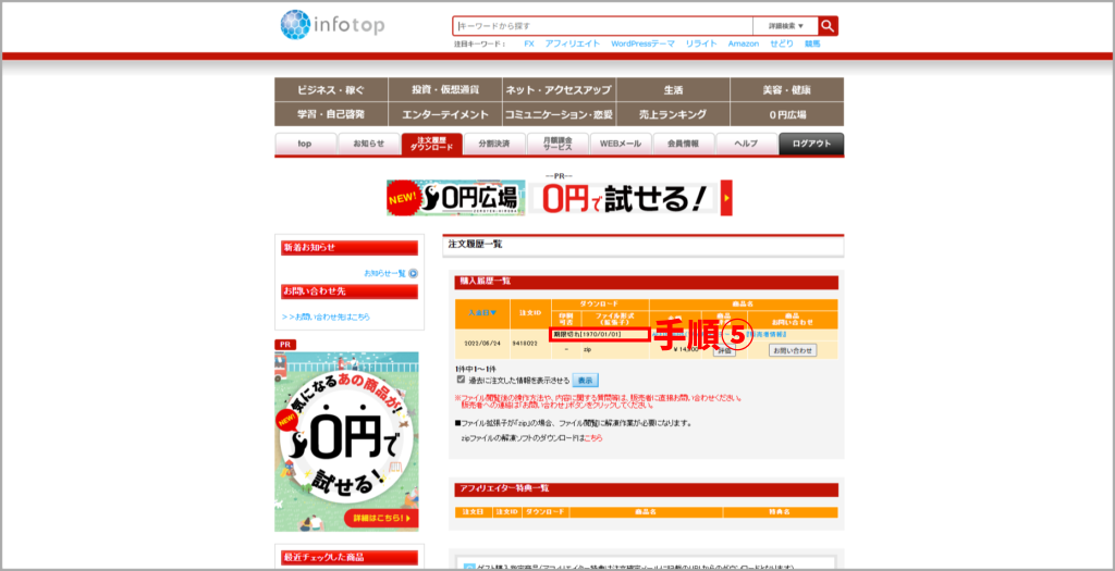 「⑤注文履歴 ダウンロード」から「AFFINGER6」をダウンロードしたら完了です。