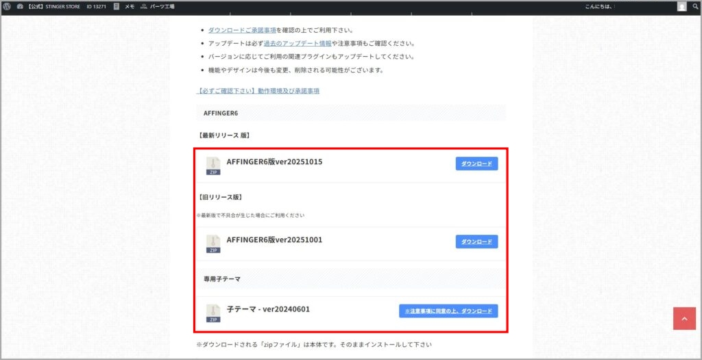 インストールの順番は①「affinger.zip」②「affinger-child.zip」の順でインストールしてください。
