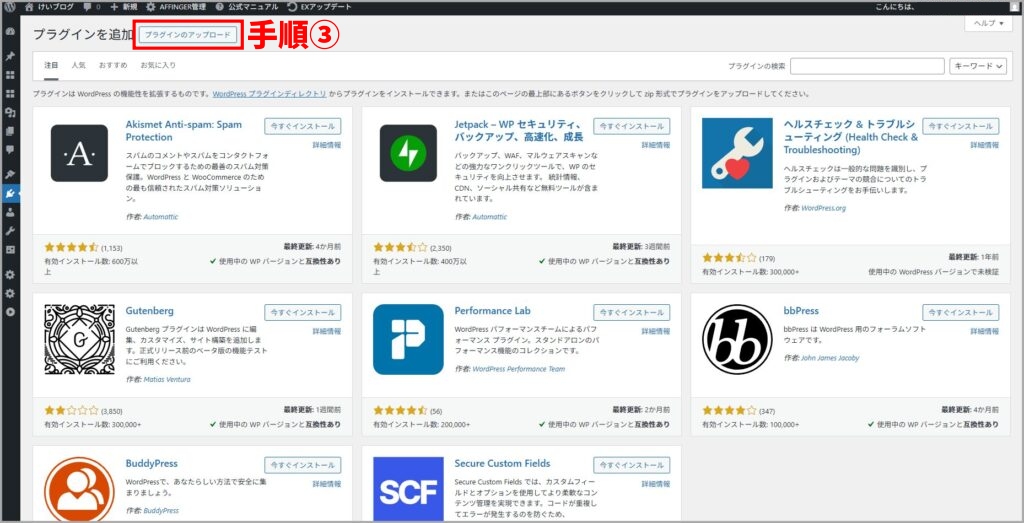 ※このときに①「affinger.zip」は有効化しないようにしましょう。②のデータ保存ができる「affinger-child.zip」をアップロードした際に有効化するをクリックします。