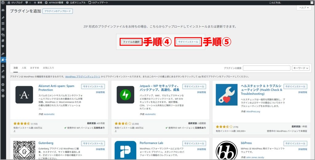 「④ファイルの選択」から“AFFINGER ブロック”を選び「⑤今すぐインストール」をクリックしてください。