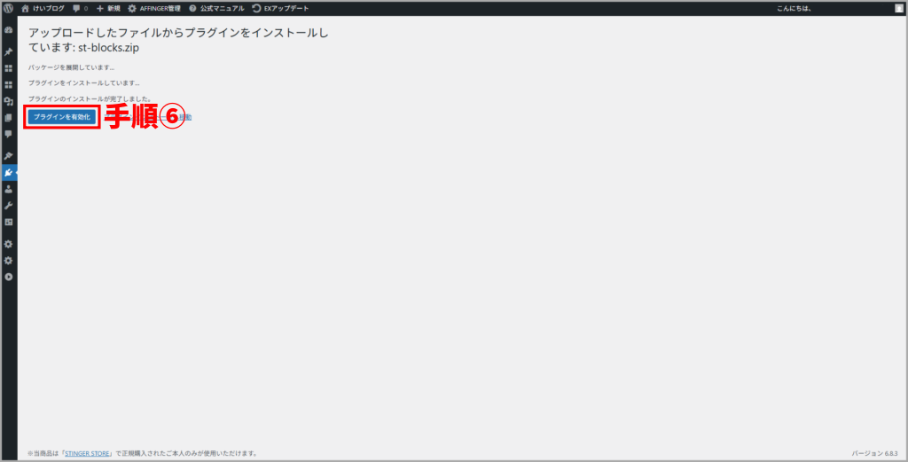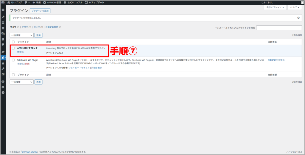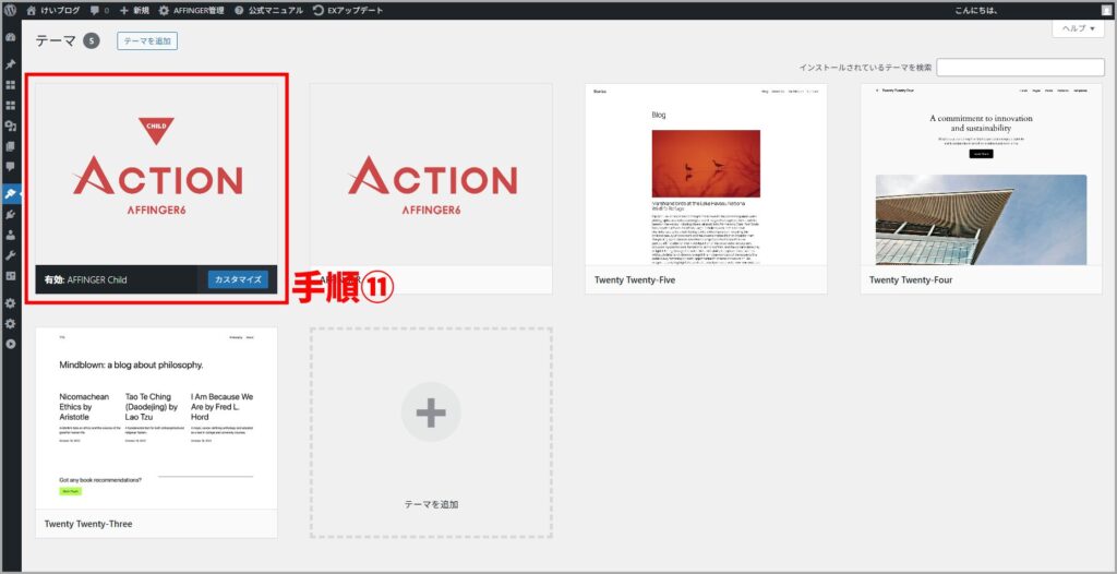 「⑪affinger-child」をインストールして有効化したら完了です。