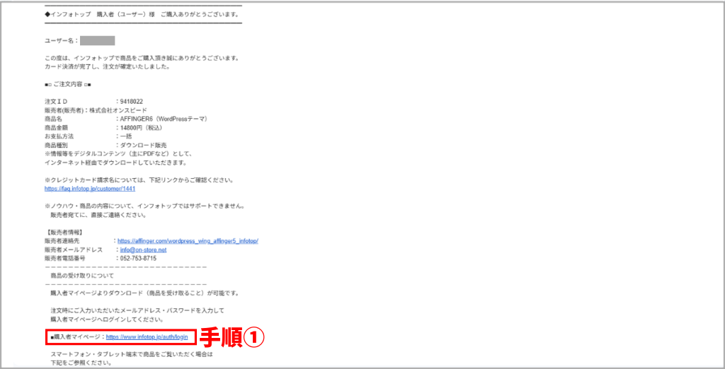 オンスピード(サービス提供会社)からメールが届くので「①購入者マイページ」へ移動します。
