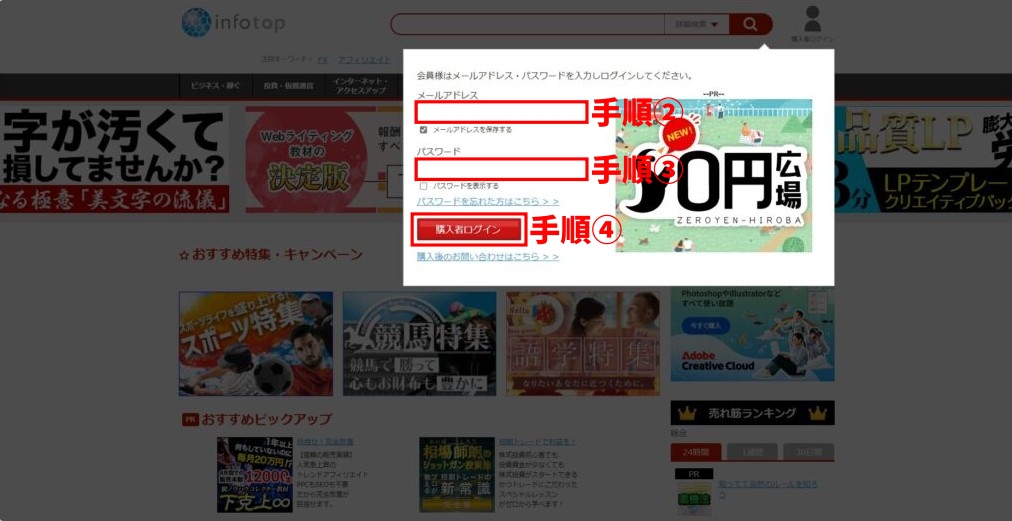 「②メールアドレス」「③パスワード」を入力→「④購入者ログイン」をクリックしてください。