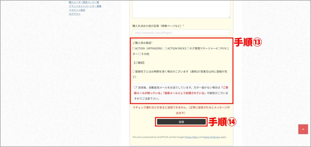 「⑬各項目」にチェックを入れ→「⑭送信」をクリックします。