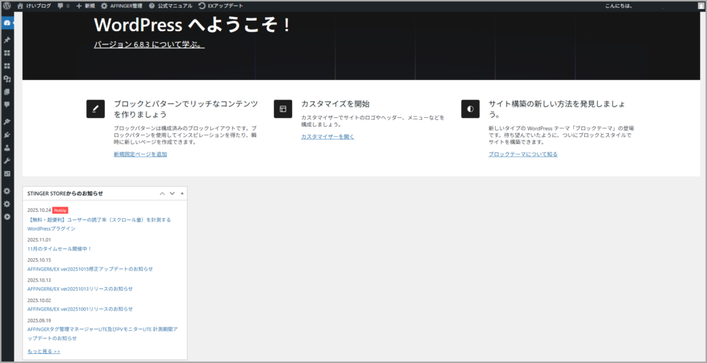 AFFINGER6の最新情報はWordPressのダッシュボード画面に表示されます。
