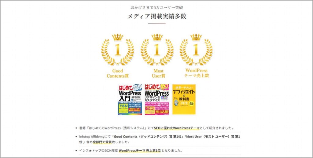 見た目の美しさや収益化のしやすさを両立できるのはAFFINGER6ならではの特徴といえるでしょう。