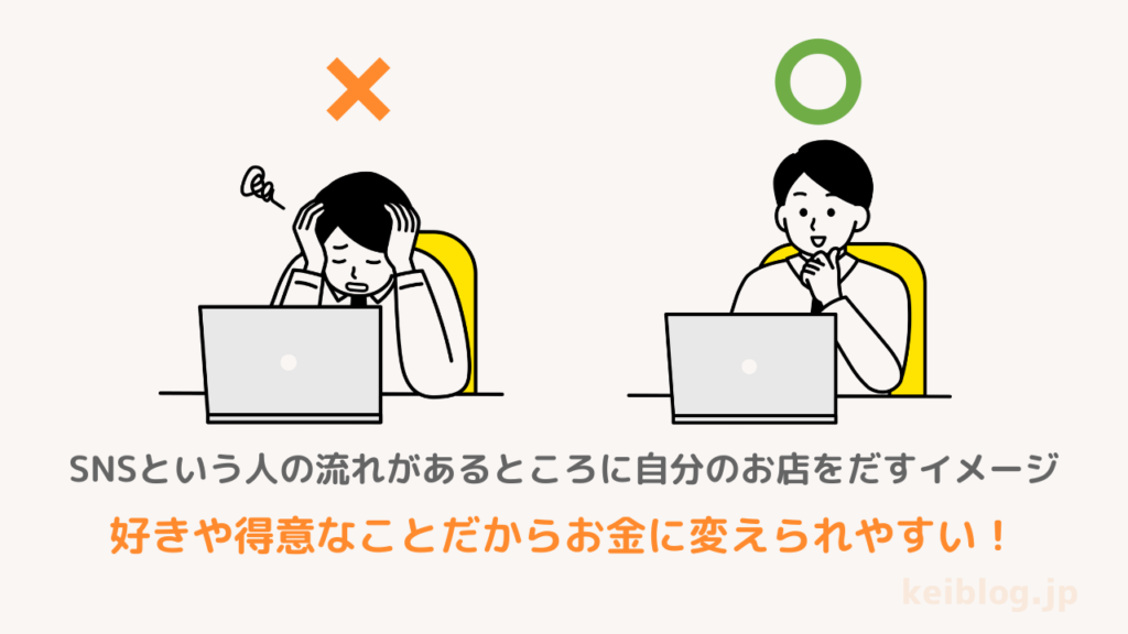 イメージとしては、SNSという人の流れがたくさんあるところに、ブログという(自分のお店)をだすといった感じ。