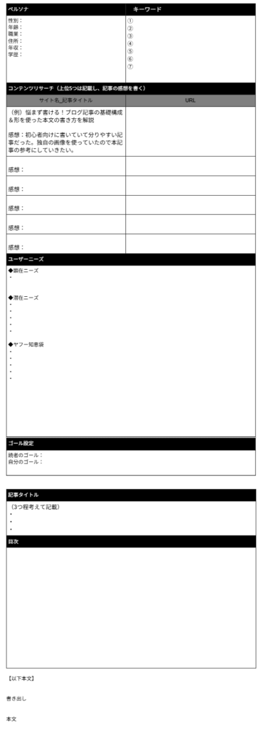 上記の手順に合わせてコンテンツ作成シートも作ってみたのでこちらもご活用ください。