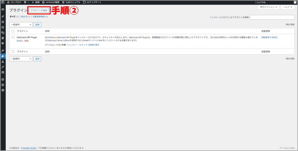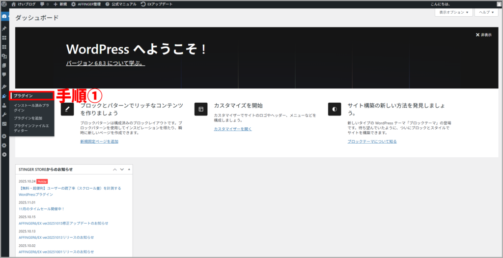 WordPressのダッシュボード画面から「①プラグイン」をクリックします。