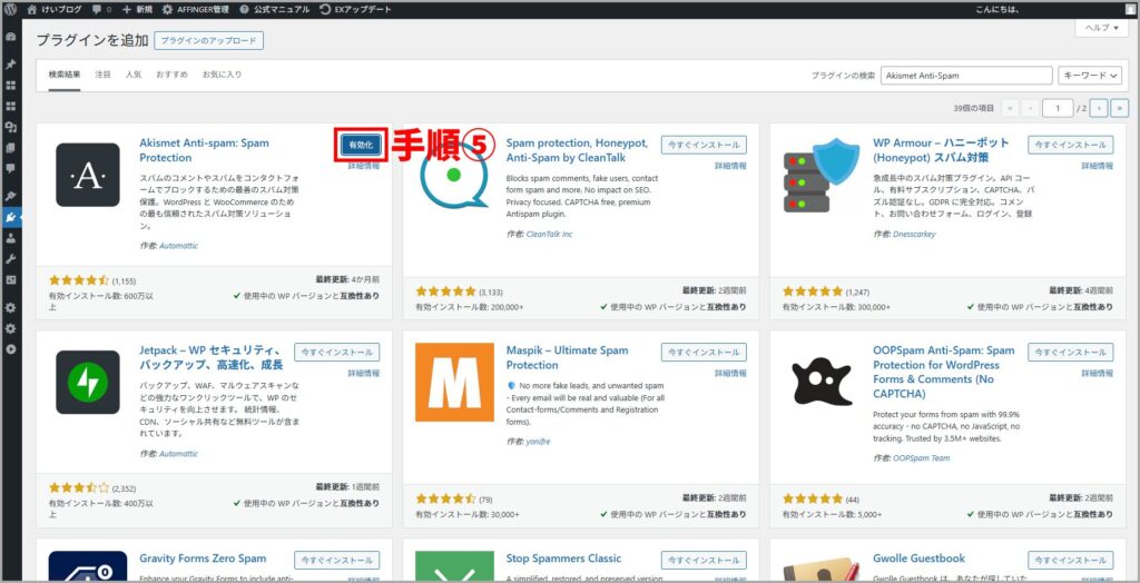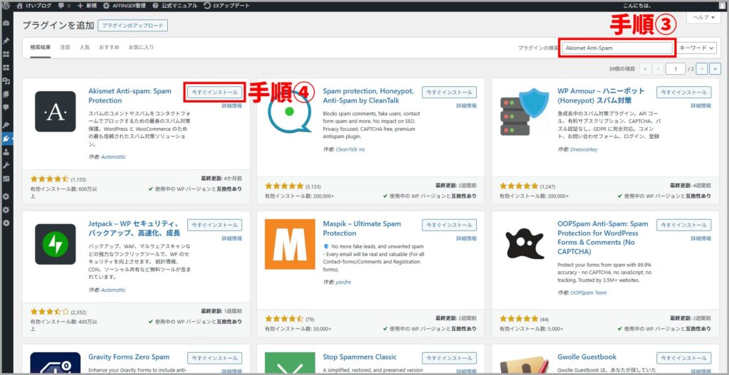 「③プラグインの検索」から“Akismet Anti-Spam”と入力し→「④今すぐインストール」をクリックしてください。