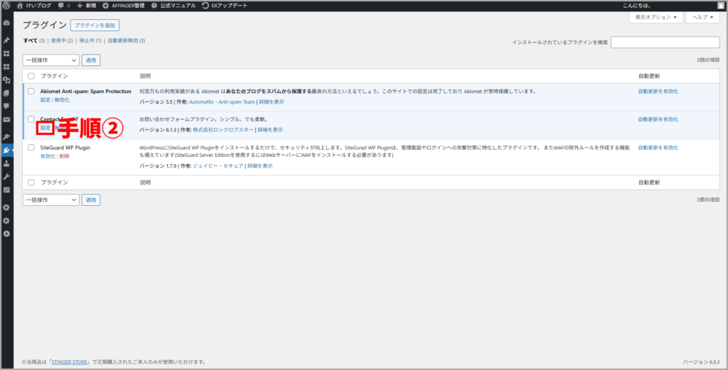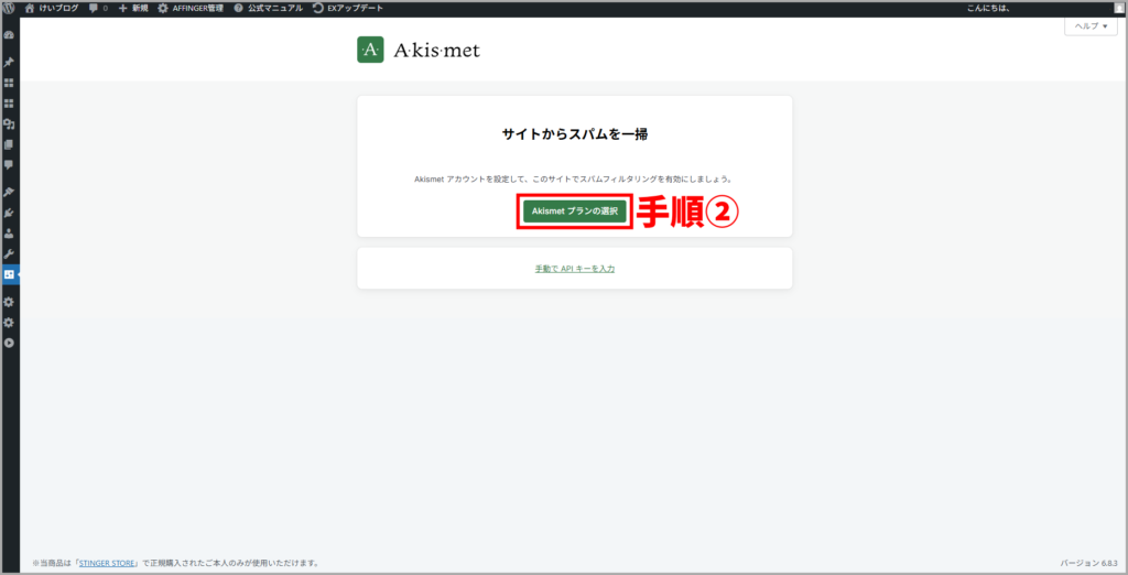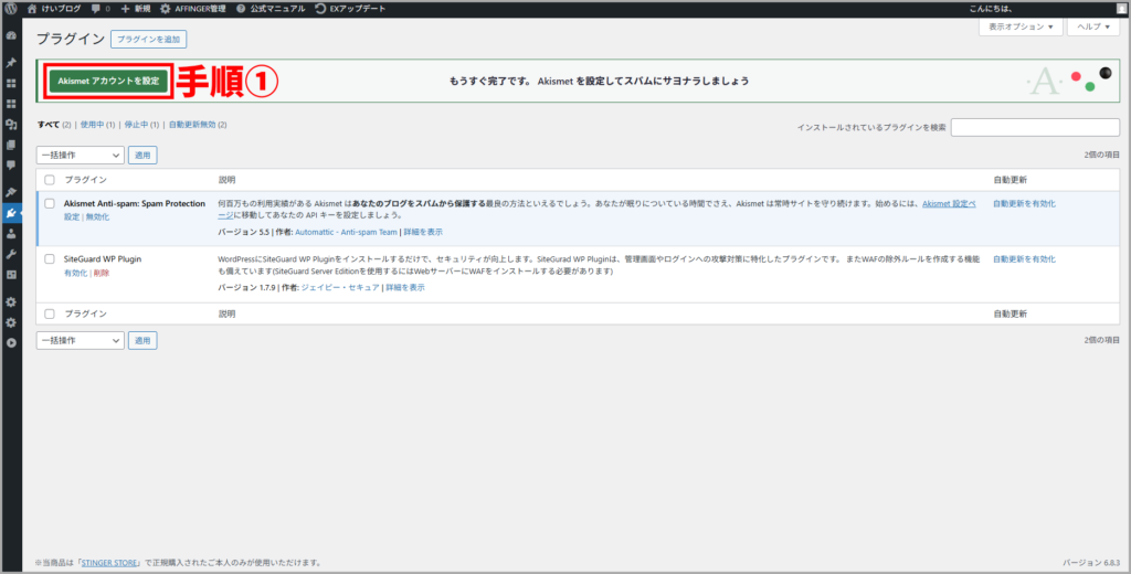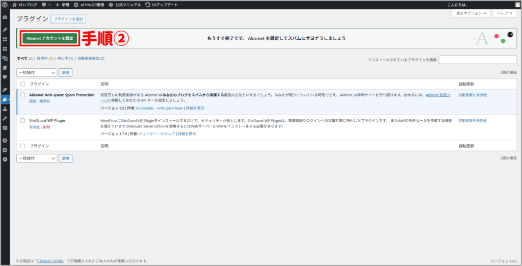 再びプラグインページに戻り「②Akismetアカウントを設定」をクリックします。