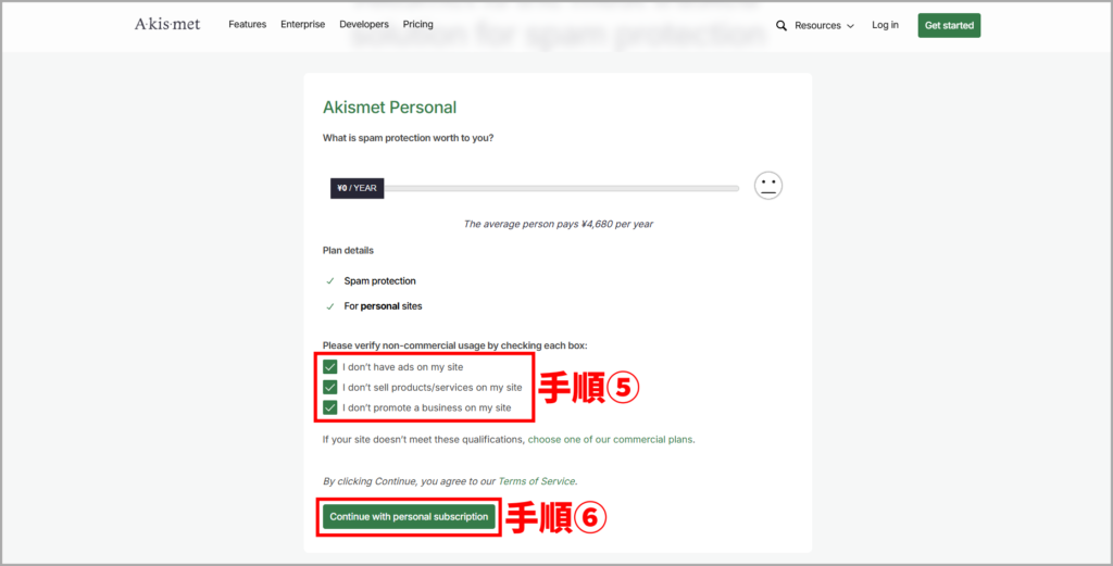 「⑤チェック欄3つ」にチェックを入れ→「⑥Continue with personal subscription」をクリックします。