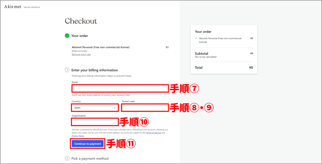 「⑦Email(メール)」→「⑧Country(国)」→「⑨Postal code(郵便番号)」→「⑩Organization(組織 / 例:けいブログ)」を入力して→「⑪Continue to payment」をクリックしましょう。