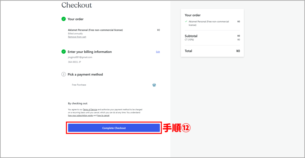 「⑫Complete Checkout」をクリックしたらアカウント登録が完了です。