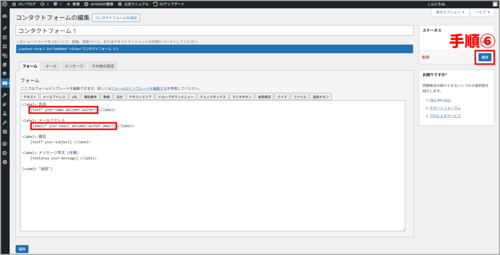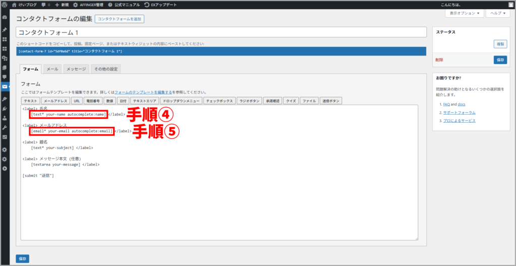 「④氏名」と「⑤メールアドレス」のコードを削除して新しいコードを貼り付けます。