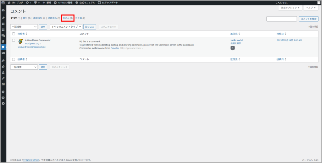 ですが、Akismet Anti-Spamを入れることで自動的にスパムコメントをフォルダに振り分けてくれるのでとっても便利です。